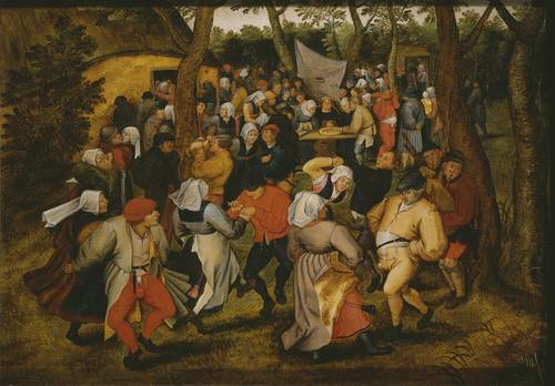 Si Bruegel connaît si bien les coutumes campagnardes, c’est qu’il allait volontiers aux kermesses et s’invitait aux noces de village. Accompagné d’un ami, il se déguisait en paysan et apportait des cadeaux pour les époux. Pieter Bruegel l'Ancien, La Danse de la mariée en plein air, 1566, huile sur bois, 119 × 157 cm, Detroit Institute of Arts, Détroit L’absence du marié, dans le tableau de Bruegel, ne semble pas déranger les invités : tous sont occupés à dévorer une bouillie servie dans des écuelles, et à boire à s’en faire exploser le ventre. Tous… sauf la mariée !