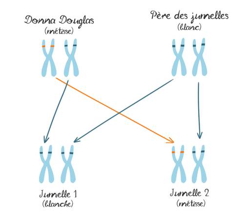 "Tout ce qui se ressemble n'est pas identique." William Shakespeare Bonjour, 16 janvier 1997, Angleterre. L’Anglo-Jamaïcaine Donna Douglas n’en croit pas ses yeux. Les jumelles qu’elle vient de mettre au monde ne se ressemblent pas du tout : l’une est blanche et l’autre métisse ! Illustration Sciencetips Mais comment des jumelles peuvent-elles être si différentes ? Tout simplement parce que ce sont des fausses jumelles : contrairement aux vraies, elles n'ont pas les mêmes gènes. Illustration Sciencetips Or, ces chromosomes sont présents en deux exemplaires : nous avons donc deux versions de chaque gène (on parle "d'allèles"). Par exemple, pour l'information "couleur de peau", Donna étant métisse, un de ses chromosomes porte l'information "peau blanche" et l'autre "peau noire" (évidemment, c'est un peu plus compliqué que ça en réalité…). Illustration Sciencetips Lors de la formation des cellules sexuelles (les ovules et les spermatozoïdes), les paires de chromosomes se séparent. Illustration Sciencetips Et c'est exactement ce qu'il s'est passé avec les jumelles Douglas. Si leur père (blanc) a donné uniquement l'information "peau blanche", leur mère (métisse) en revanche a donné l'information "peau blanche" à l'une et "peau noire" à l'autre. La famille des jumelles Lucy (en bas, au centre) et Maria (en bas à droite), photo : DR Le nombre de gènes d'un humain est estimé à près de 30 000. Et chacun existe sous la forme d'au moins 2 allèles. Tout ceci étant distribué aléatoirement lors de la formation des cellules sexuelles, puis lors de la fécondation, le nombre de combinaisons possibles est donc infini. Lucy et Maria Aylmer, 2015, photo : Worldwide Features/Barcroft/Landov " Tout ce qui se ressemble n'est pas identique. " - William Shakespeare - En un clic, dites-nous si par rapport à d'habitude : Des conseils, des idées, des critiques ? Copyright © Artly Production SAS, Tous droits réservés. |