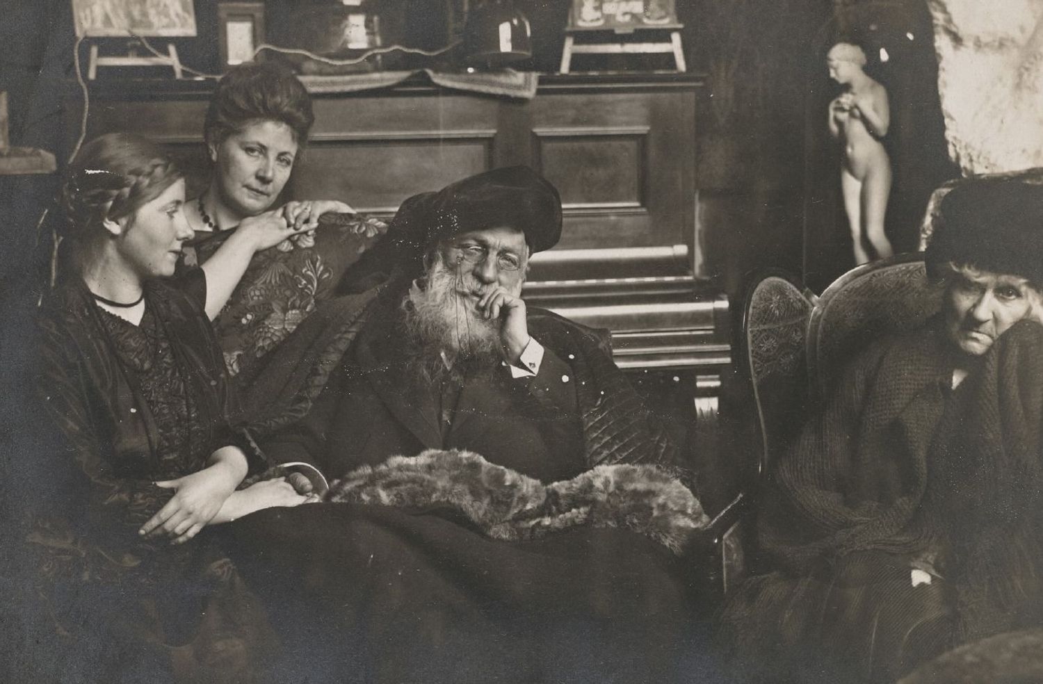 De gauche à droite : Henriette (la fille de Jeanne), Jeanne Bardey, Auguste Rodin et sa compagne Rose Beuret, avril 1916, épreuve gélatino-argentique, 12 x 18 cm, Musée Rodin, Paris