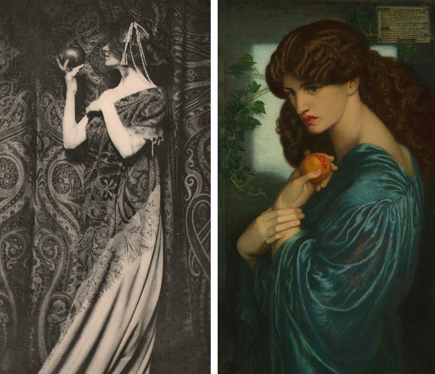À gauche : Zaida Ben-Yusuf, L'odeur des grenades (détail), 1901 / À droite : Dante Gabriel Rossetti, Proserpine (détail), 1874, huile sur toile, 125 x 61 cm, Tate Britain