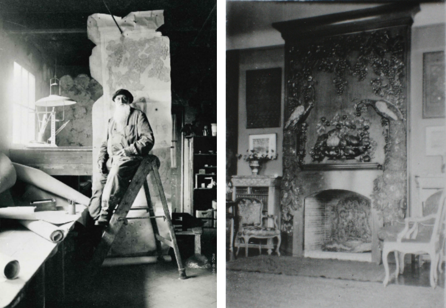 À gauche : Auguste Delaherche travaillant sur la cheminéedans son atelier, 1924. À droite : La Cheminée aux Paons chez son ancien propriétaire dans le Var vers 1928. Photo : MUDO-Musée de l’Oise / DR