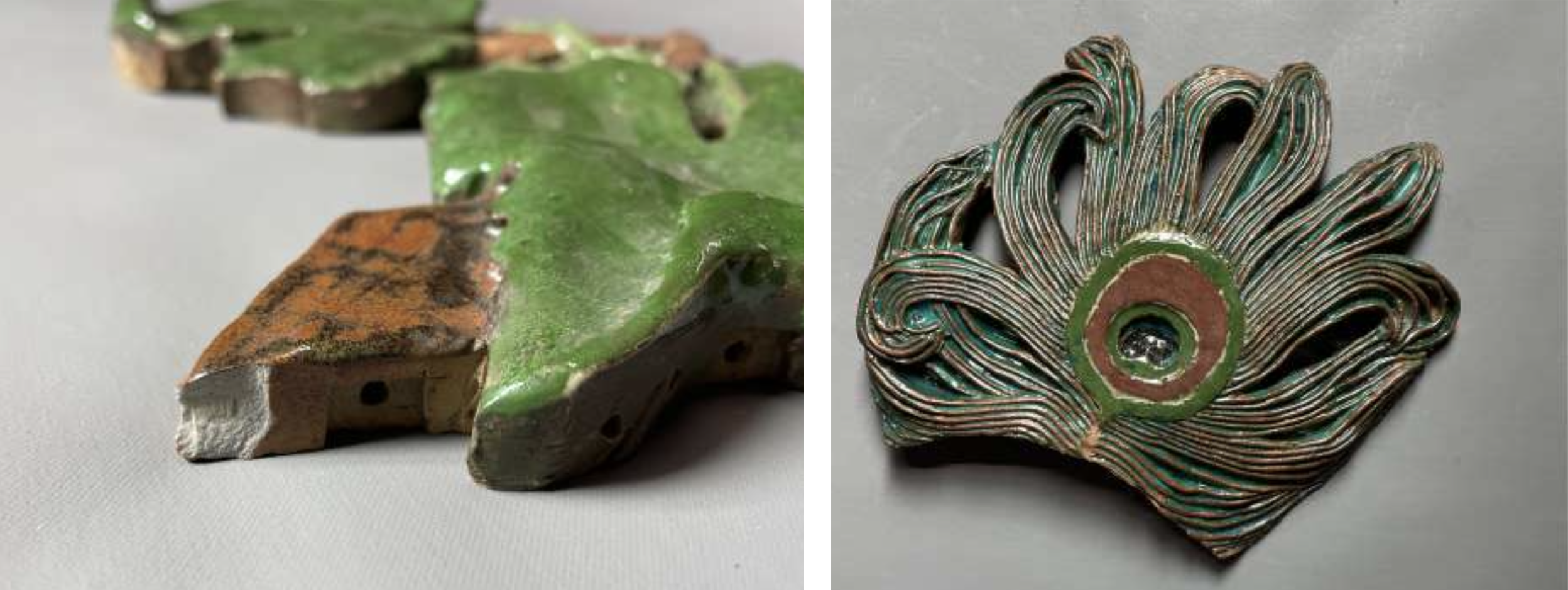 Éléments en grès émaillés de la Cheminée aux Paons lors de leur restauration. Photo : MUDO-Musée de l’Oise / DR