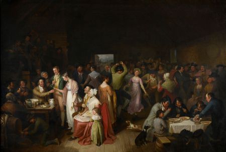 Alexander Carse, The Penny Wedding, vers 1819, huile sur toile, 90 x 130 cm, National Gallery of Scotland, Édimbourg Ce tableau a été acquis par le musée grâce au legs de James Cowan Smith