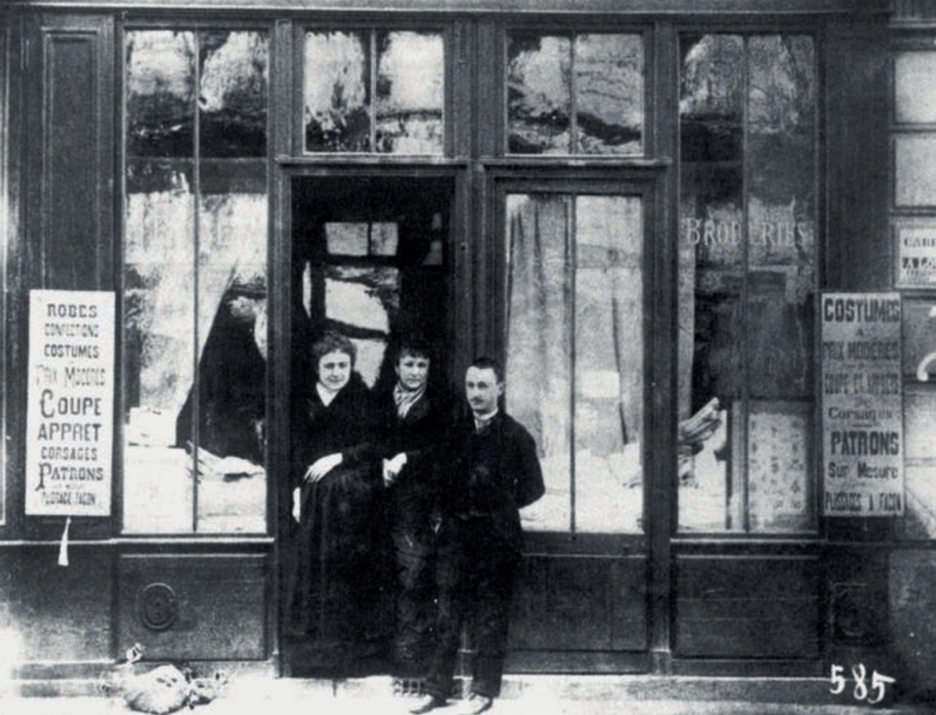 Marguerite Marquet, une ouvrière et Albert Marquet (âgé de 18 ans) devant la mercerie de Madame Marquet, 1893