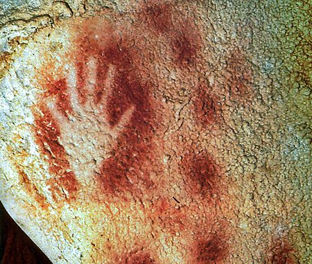 Main en négatif sur les parois de la grotte du Pech Merle, Cabrerets, Lot, France