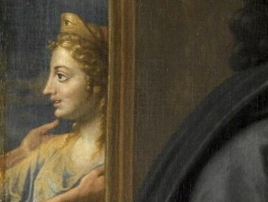 Elle n’est autre que l’allégorie de la Peinture savante, qui travaille avec sa raison. Enlacée discrètement par les bras de l’Amitié, elle salue le soutien indéfectible de Chantelou à son peintre. C’est grâce à lui que Poussin peut travailler comme il l’entend.