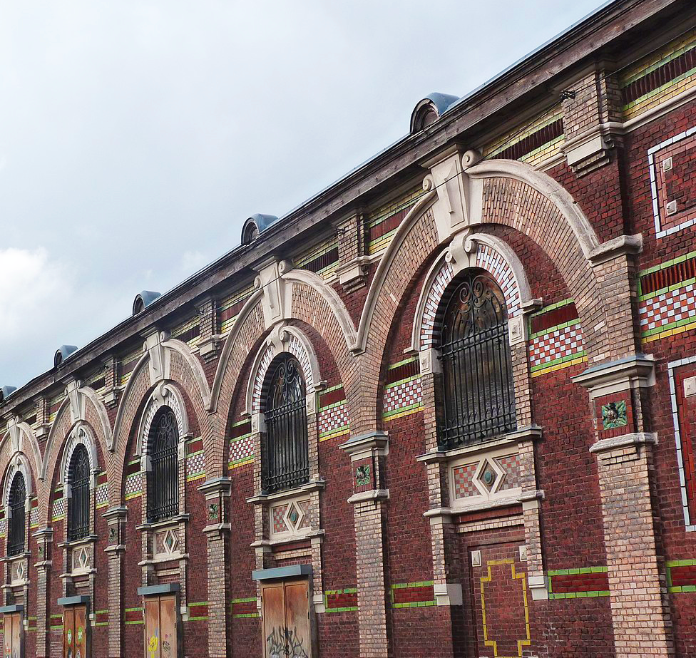 Et si la structure générale est en béton, Albert Bouvy laisse libre cours à sa créativité sur les 244 mètres de la façade… Il y compose un élégant décor de briques turquoise vernies et de pierres blanches, sur un fond de briques rouges, la spécialité de la région. À ceci s’ajoutent des colonnes saillantes, des sculptures, des frises et des arcs qui complètent cette ornementation soignée, rare dans l’architecture industrielle.