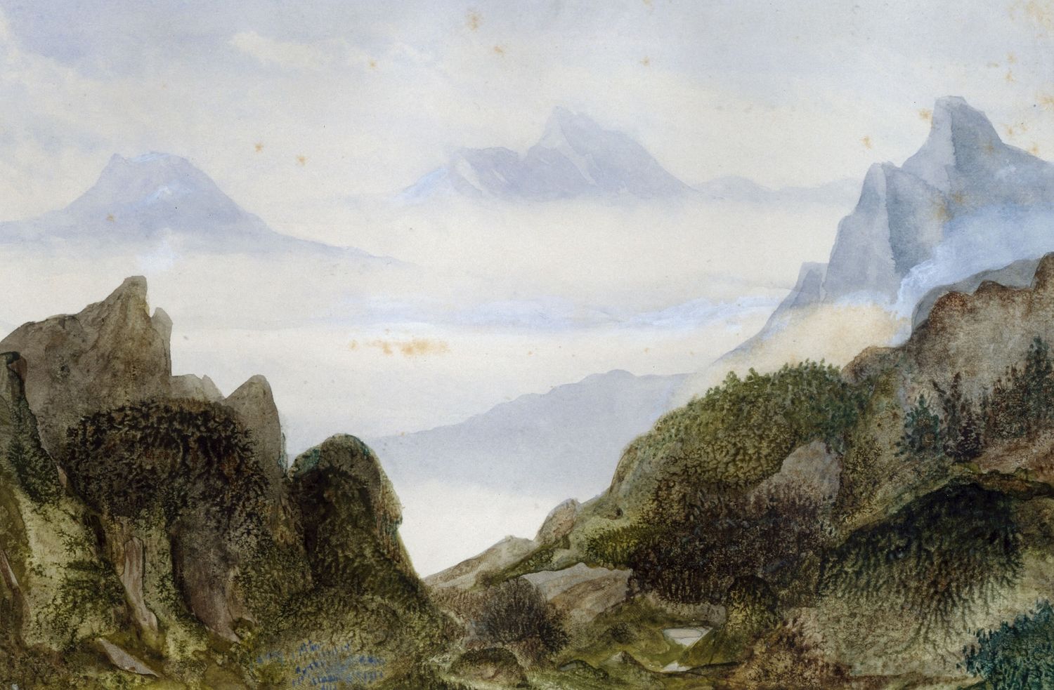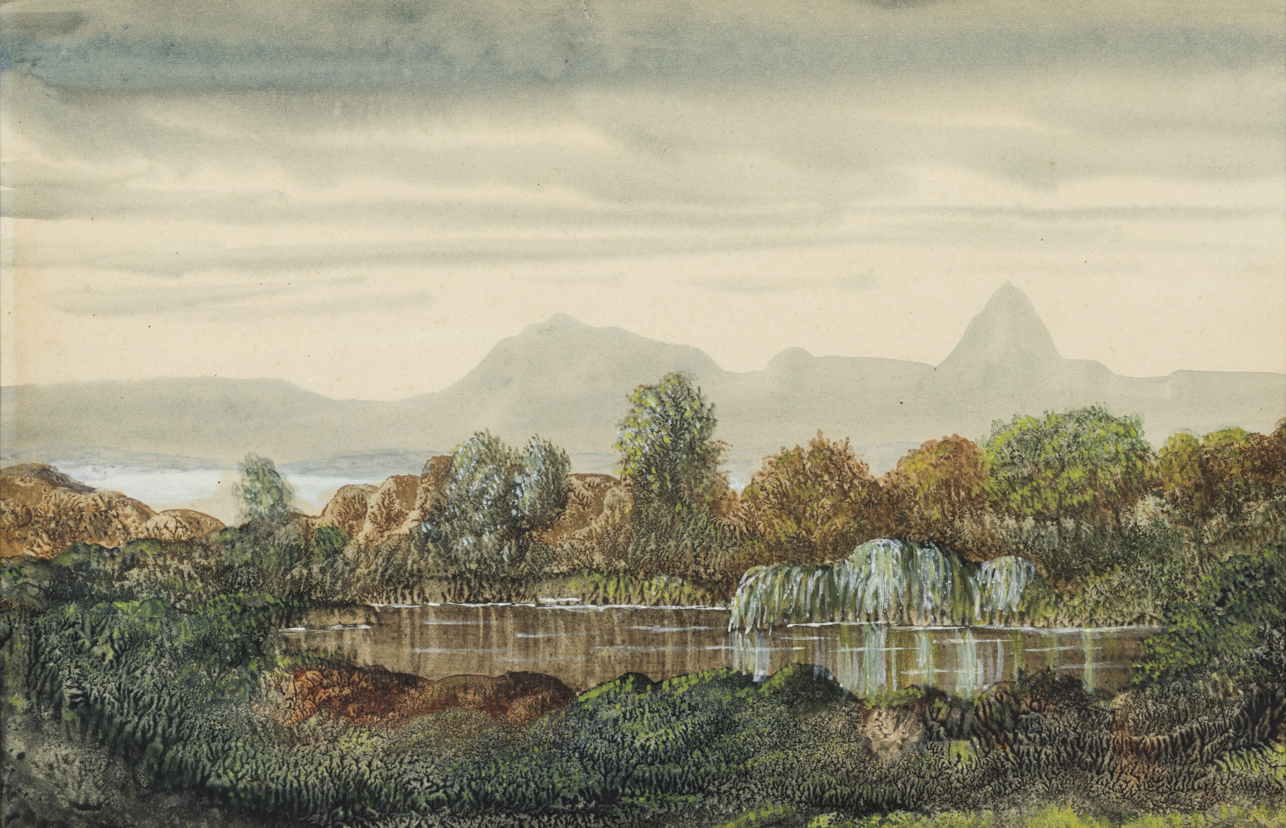 George Sand et Maurice Sand, Paysage imaginaire, vers 1870-1876, aquarelle, 15 x 23 cm, collection privée