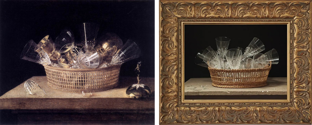 À gauche : Sébastien Stoskopff, Corbeille de verres, 1644, huile sur toile, 51 x 62 cm, musée de l'Œuvre Notre-Dame, Strasbourg / À droite : Catherine Auguste et Henri Peyre, Panier de verres à la façon de Stoskopff, 2023, photographie, 39 x 29 cm