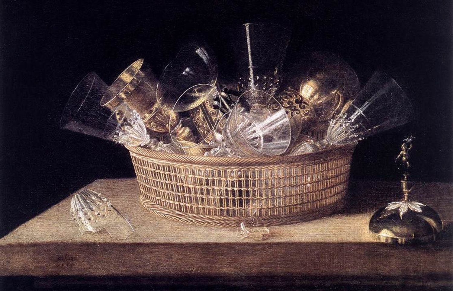 En effet, il n'est pas donné à tous les peintres de parvenir à représenter ce matériau. Stoskopff devient particulièrement habile dans cet art, au point d'être capable de compliquer l’exercice. Il s'amuse à peindre des verres rangés pêle-mêle dans un panier – une habitude propre aux foyers alsaciens. Sa composition est d'autant plus impressionnante que les effets d'absorption et de réflexion de la lumière se conjuguent. On devine alors des objets métalliques brillants au travers des verres…