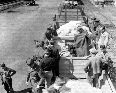 Des soldats américains et des travailleurs allemands organisant le rapatriement en Pologne du retable de Stoss depuis Nuremberg, avril 1946. Photo : US Government Printing Office
