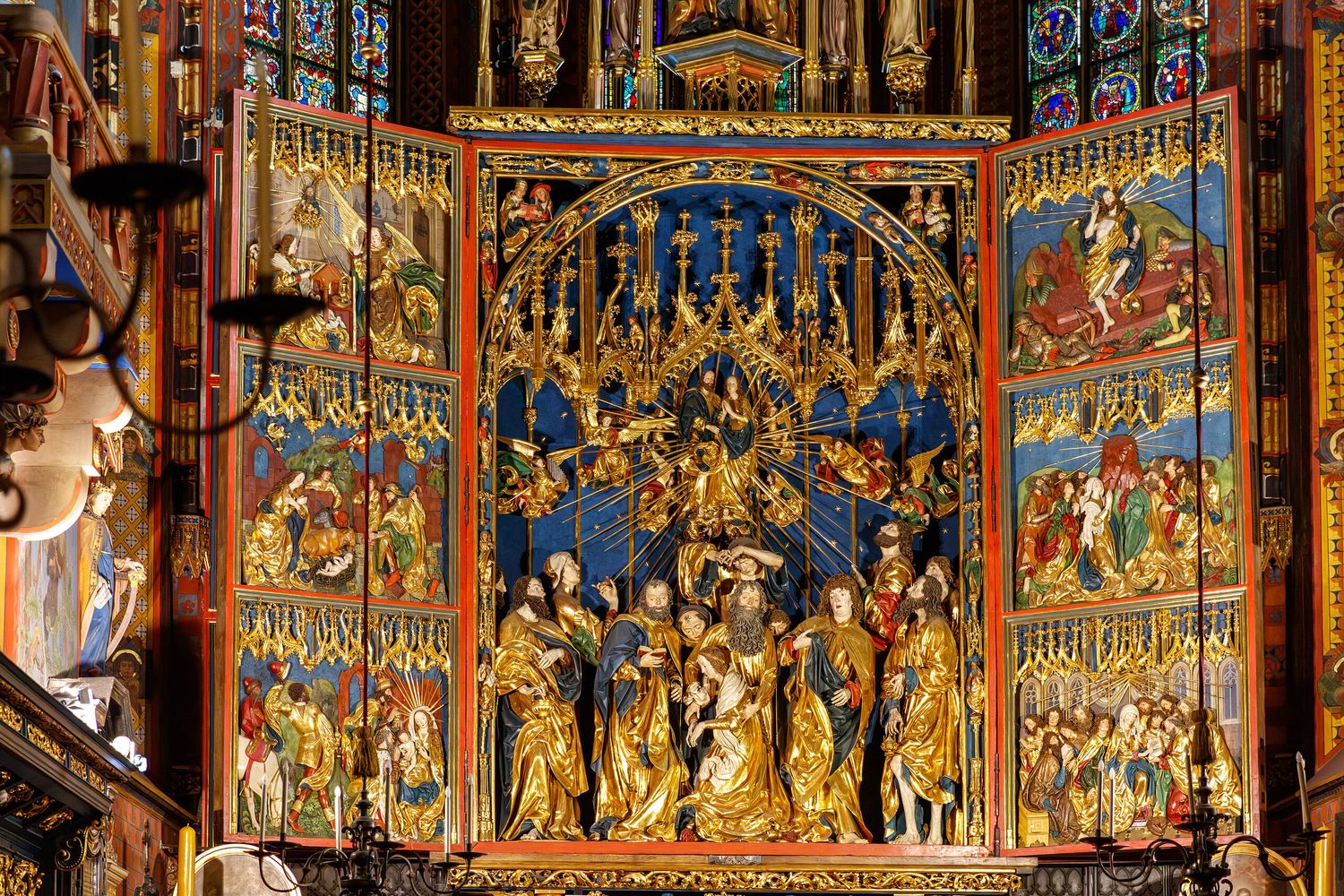 Veit Stoss, retable de Cracovie, 1477-1489, sculpture en bois de tilleul, chêne et larix, peinture et feuille d'or, 130 x 110 cm. Photo : Marmontel, CC BY 2.0