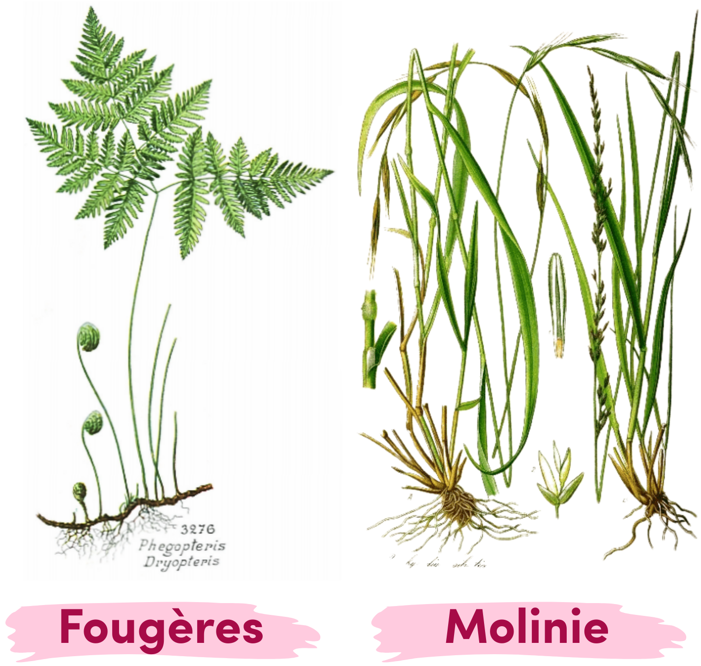 À gauche : Fougères à feuilles isolées, Flore complète illustrée en couleurs de France, Suisse et Belgique, Delachaux et Niestlé, 1985 / À droite : Molinie, Flore d'Allemagne, Autriche et Suisse, Otto Wilhelm, 1885