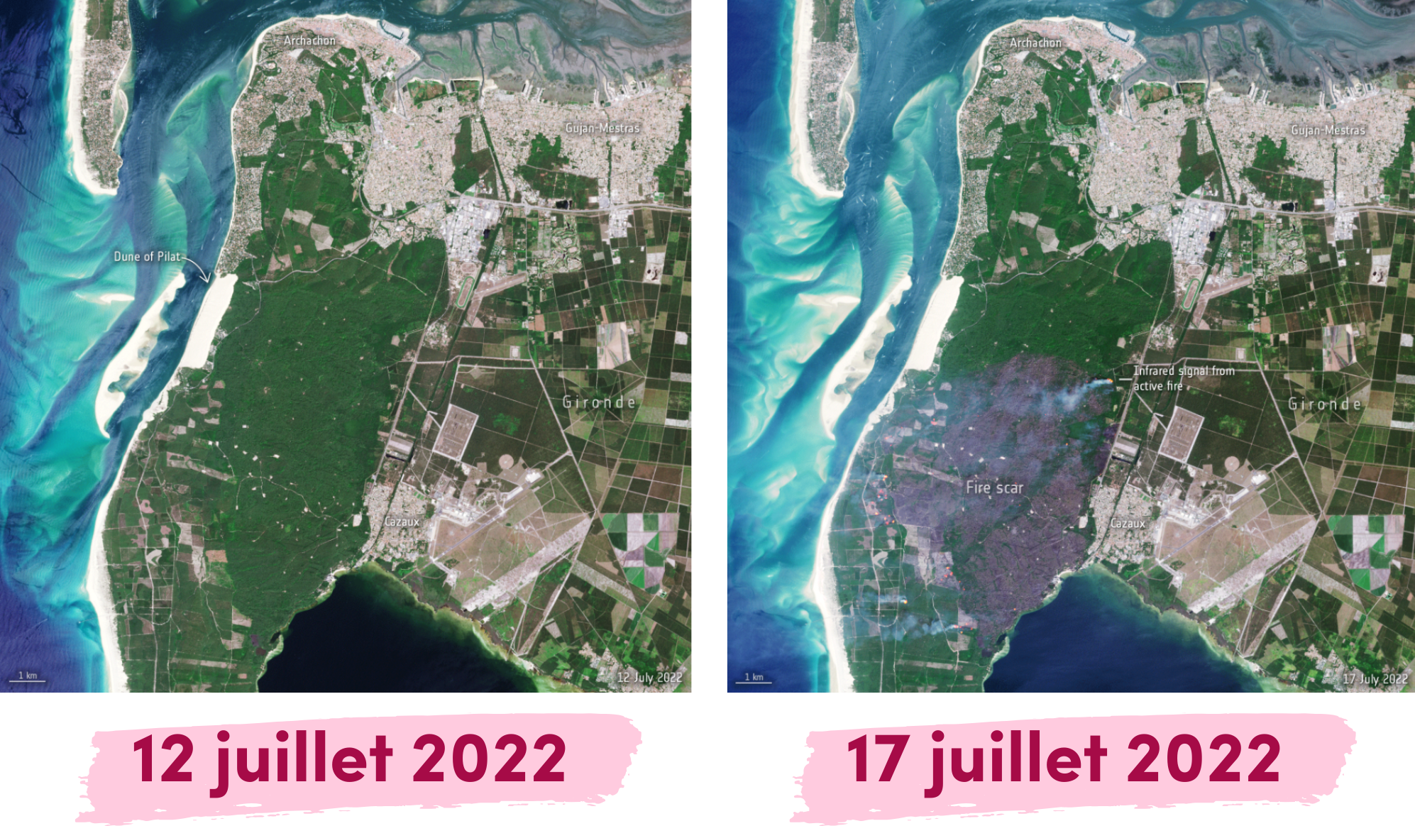 Photos satellite des effets des incendies sur la flore de la Gironde, European Space Agency, 2022