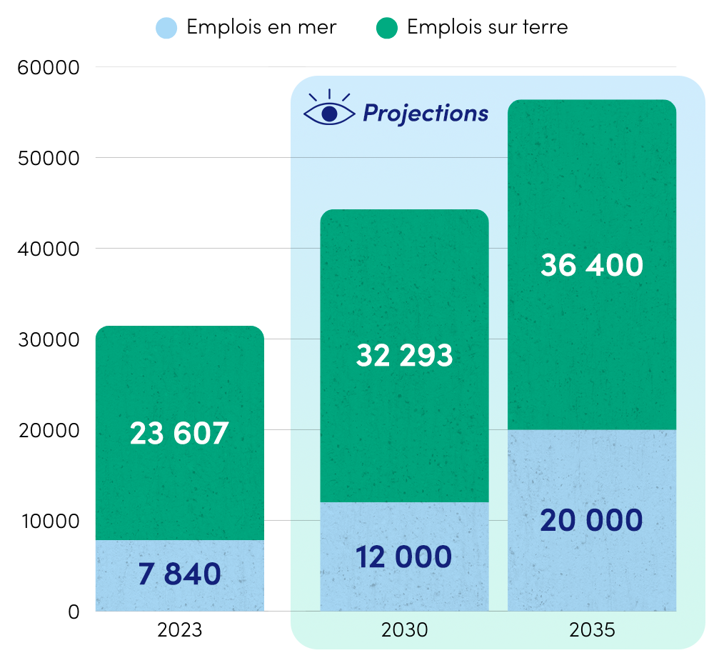 Son développement rapide implique la naissance et l’évolution de certains métiers, car il faut répondre aux besoins. D’une part, de nouveaux centres de formation et de reconversion apparaissent, et d’autre part, certains postes peuvent s’adapter à la transition énergétique. Par exemple, des transferts de compétences sont possibles depuis les plateformes pétrolières vers l’éolien en mer, les conditions de travail étant similaires.