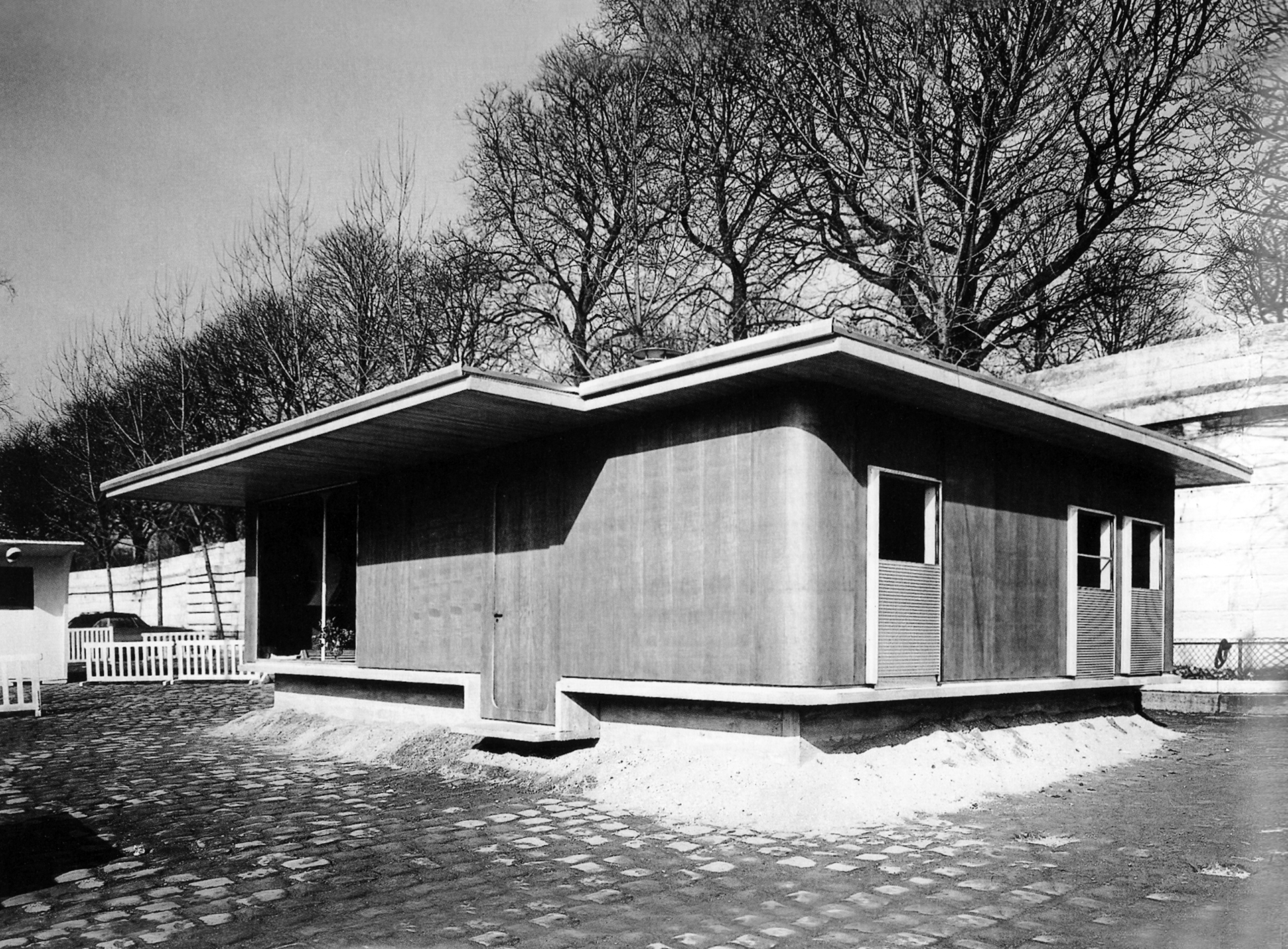 Jean Prouvé, Maison des Jours Meilleurs, exposition de l'Habitation, Salon des arts ménagers Quai Alexandre-III, Paris, février 1956. Photo : Fonds Jean Prouvé. Centre-Pompidou, MNAM/CCI, Bibliothèque Kandinsky, Dist RMN-GP