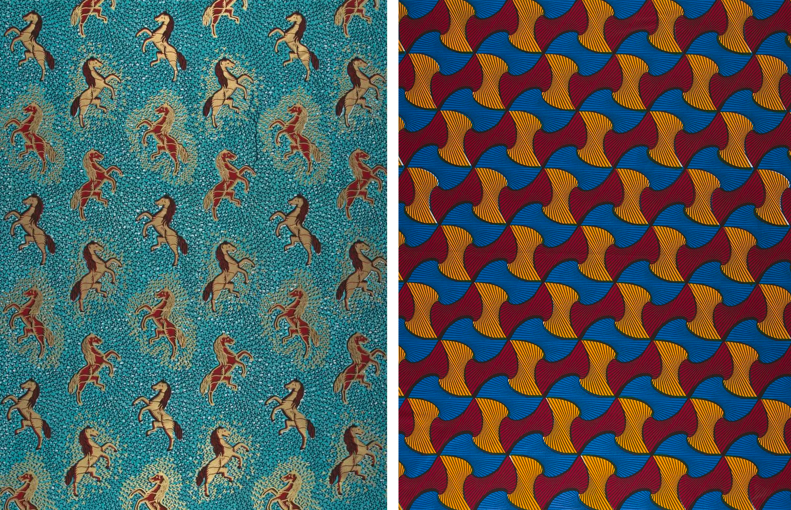 À gauche : Le tissu wax Je cours plus vite que ma rivale ; à droite : Le tissu wax Chérie, ne me tourne pas le dos. Photos : Vlisco, DR