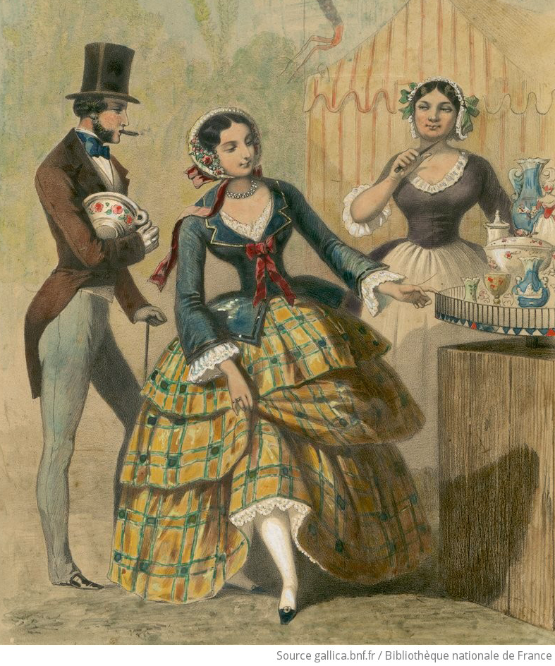 "Un jeune couple achète des objets en porcelaine dans une foire", vers 1850, estampe publiée dans Un siècle d'histoire de France par l'estampe, 1770-1870. Vol. 159, collection de Vinck, Bibliothèque nationale de France, Paris