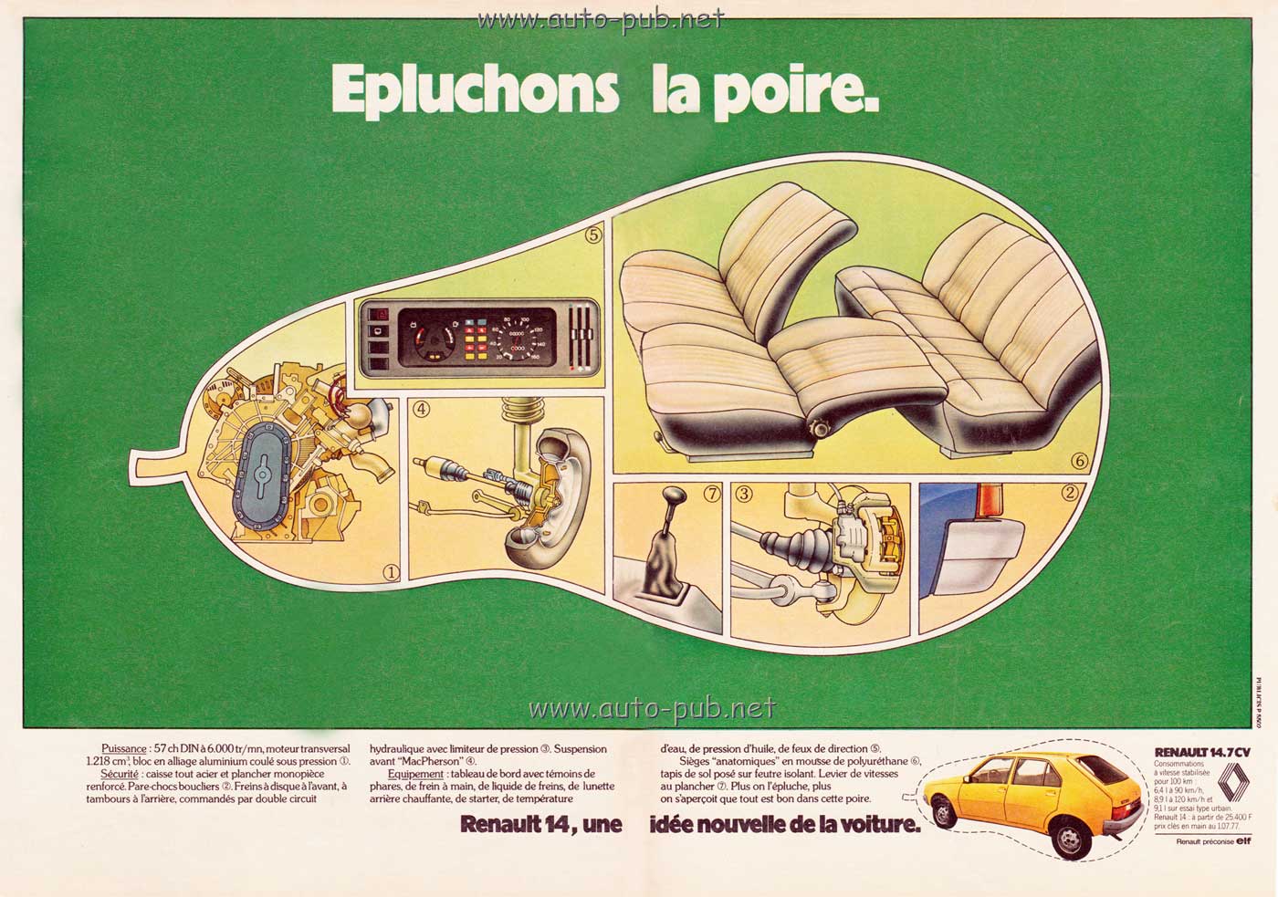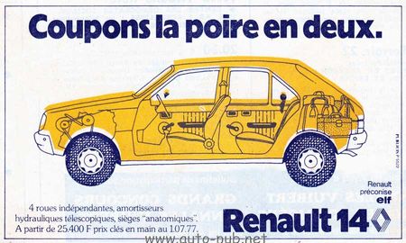 "La Renault 14, c’est comme une poire", annonce le clip promotionnel qui passe à la télé et même dans des salles de cinéma. Au fil des publicités, tous les jeux de mots y passent, tels que "couper la poire en deux" ou "épluchons-la" pour découvrir son intérieur.
