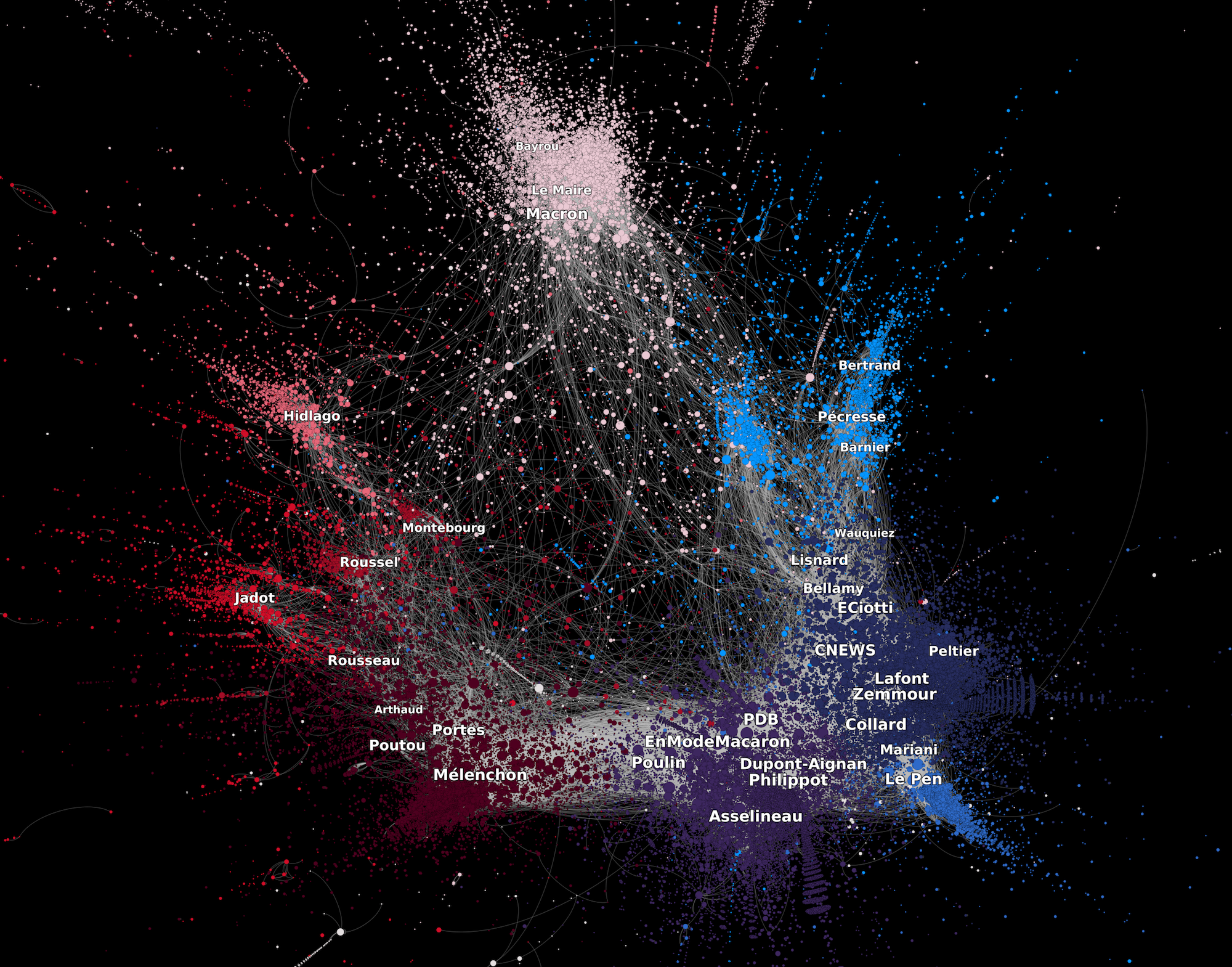 Graphique réalisé à partir de millions de tweets de début 2022, illustrant d'où part une information, comment un mot-clé circule, et dans quels espaces, publié dans David Chavalarias, Toxic Data, éditions Champs, mars 2023