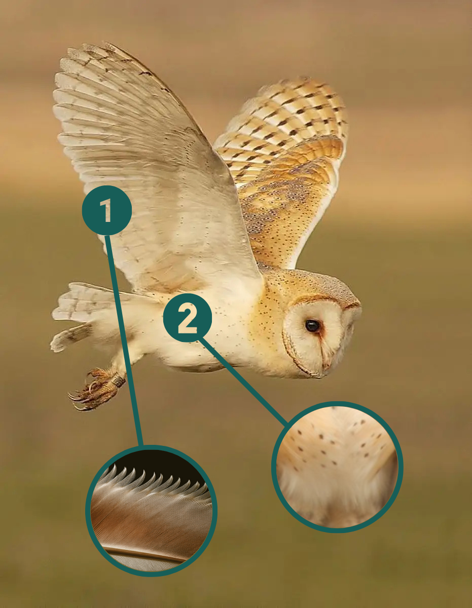 Son secret réside dans ses plumes très spéciales, bien différentes par exemple des plumes lisses d'un faucon, parfaites pour la vitesse mais bruyantes. Celles de la chouette effraie possèdent un duvet qui étouffe les sons et surtout, des bords frangés comme de petits peignes, appelés serrations. Ces serrations ont un rôle crucial. En effet, quand l'air est fendu par l'aile, il crée des turbulences responsables du bruit. Les serrations de la chouette brisent ces grosses turbulences en une multitude de micro-perturbations, réduisant ainsi le bruit.