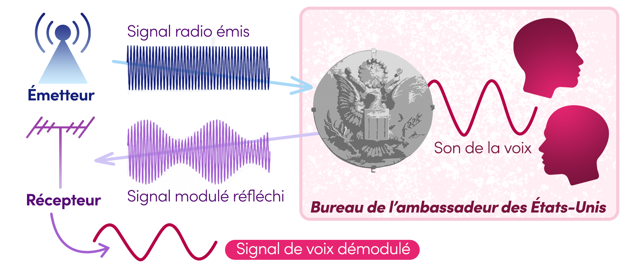 Dès lors, le signal radio réfléchi par le tube est modifié par la vibration de la voix. On dit que le signal est "modulé". Une fois le signal modulé renvoyé et reçu, il est possible de le démoduler pour récupérer uniquement la partie correspondant au son. C’est le même principe qui nous permet d’écouter un poste de radio (en mode AM).