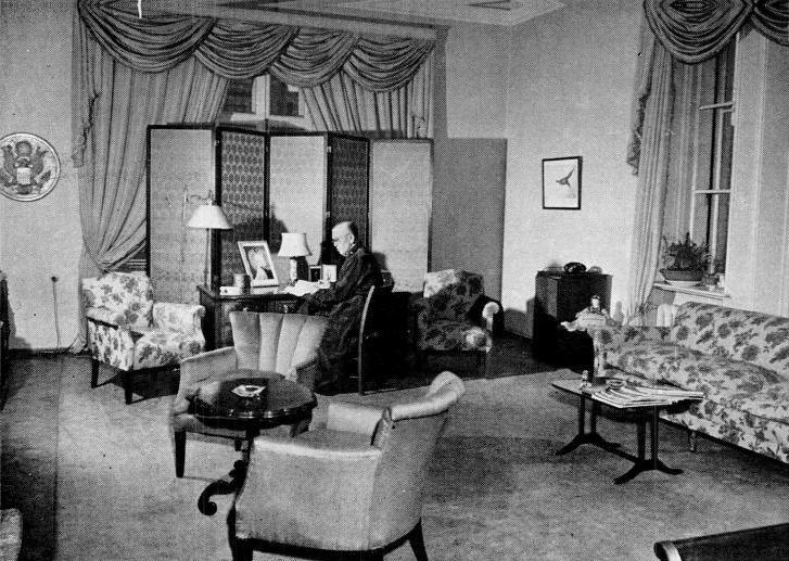 Bureau de la Spaso House, utilisé par le secrétaire d'État Marshall en 1947, le sceau est visible à gauche, accroché au mur. Photo : National Cryptologic Museum