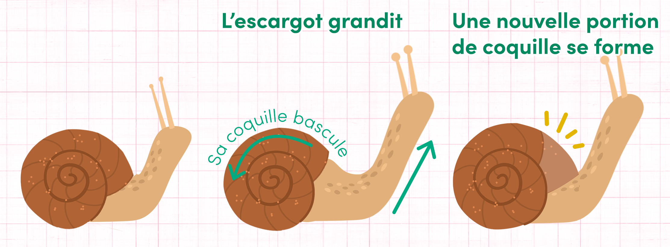 Pour comprendre, il faut d’abord s’intéresser à la formation de la coquille. Bébé, l’escargot sort de son œuf avec une petite coquille transparente, qui formera le sommet de sa coquille d’adulte.