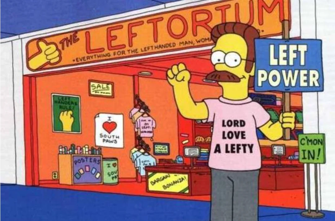 Le gaucher Ned Flanders dans son magasinThe Leftorium, Le Palais des Gauchers, LesSimpson, saison 3 épisode 38, créé par Matt Groening