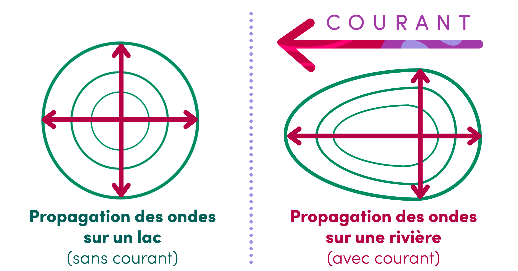 Reprenons l’exemple d’une vague. Si l’on jette une pierre dans un lac, des ondes se propagent en cercles concentriques. Mais si on jette une pierre dans une rivière, c’est-à-dire dans de l’eau en mouvement, on voit que la vitesse de déplacement des ondes change selon la direction de propagation : les ondes allant dans le sens de la rivière sont accélérées par le mouvement de l’eau, tandis que celles qui vont dans le sens contraire sont ralenties.