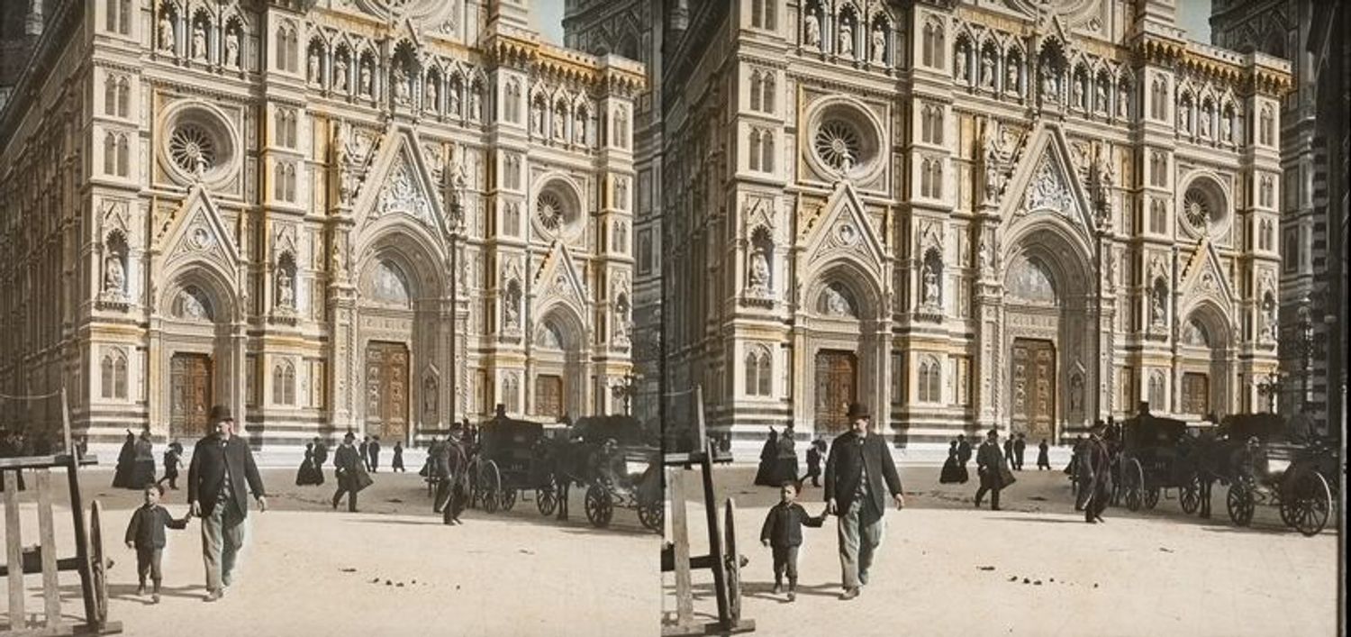 August Fuhrmann, Portail de la cathédrale de Florence, vers 1900, photographies stéréoscopiques colorisées à la main, 8,5 x 17 cm, Musée de la ville de Munich