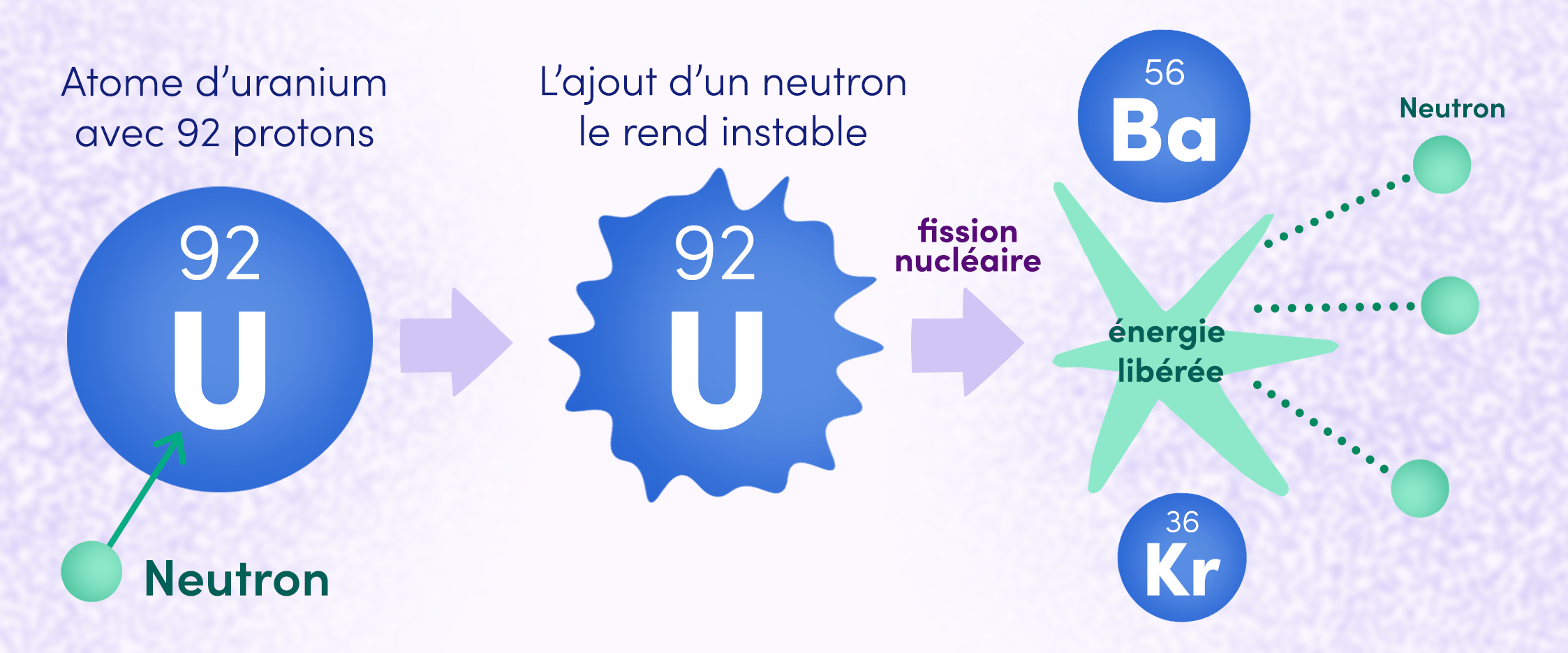 En se penchant sur les données, elle comprend que le neutron casse le noyau d’uranium, qui se transforme en deux nouveaux noyaux plus petits. Et pour conserver les 92 protons de l’uranium dans l’opération, elle prédit que s’il y a du baryum (56 protons), il doit aussi y avoir du krypton (36 protons). Ce qui est confirmé par la suite.