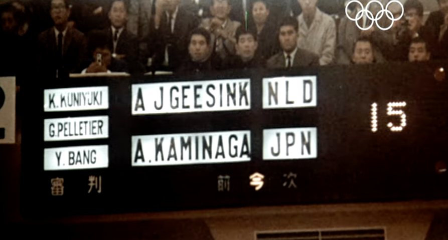 Lors de cette finale "toutes catégories", Geesink entraîne au sol son adversaire Akio Kaminaga après neuf minutes d'un combat tendu. Le Japonais est en fâcheuse posture : Geesink l'immobilise contre le tatami, faisant peser sur lui ses 115 kilos pour 1,98 mètres de hauteur. Kaminaga se débat comme il peut, mais après les 30secondes d'immobilisation requises, l'arbitre signale la fin du combat. Le Néerlandais triomphe!